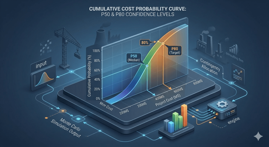 - The simulation produces probability-based metrics such as P50 and P80 cost estimates.